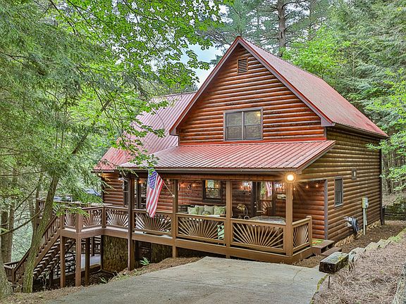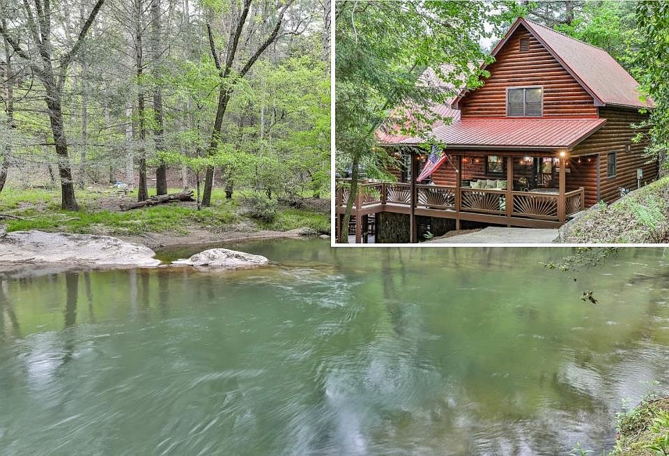 Imagine spending the afternoon dipping your toes in your own backyard's personal slice of the Cartecay River, while enjoying the calming melody of the nearby rapids. Make your way up to the lower deck with relaxing hot tub and fire pit, or to the main level deck where you can enjoy the views of the river under a gorgeous tree top canopy. The spacious deck area wraps into the covered front porch that is the perfect spot to sip your coffee or iced tea while hoping to catch a deer stroll by. The natural beauty of this cabin's setting only amplifies when you step inside to find a spacious and well thought-out interior. Featuring stunning architectural details like double crows foot beams in the lofty great room ceiling, large river rock gas fireplace, and rear wall full of windows and French doors. The spacious great room makes entertaining a breeze with plenty of seating space, dining area, and flow to the kitchen. The kitchen has ample counter space, plus a middle island, granite counters, and tons of cabinet & shelf space. Off the kitchen find a laundry/mudroom plus a generously-sized bedroom with en-suite bath. Once up the stairs to the 2nd floor, look out over the great room from the unique balcony spot. There are also two more spacious bedrooms with a full bathroom. The daylight basement level includes a large living space, sleeping area, full bathroom, another room, plus large mechanical/storage room. Closets are peppered throughout the house for plenty of storage. This beautiful home is located in one of the most desirable spots in Gilmer County: the wildlife sanctuary community Blackberry Mountain. Featuring a picturesque covered bridge entrance over the rapids of the Cartecay River, paved roads, underground power, and no short-term rentals, all located within an easy drive to Downtown Ellijay shopping and dining, or in the heart of apple country orchards, vineyards, and outdoor activities. Don't miss your chance to make this riverside oasis your own!