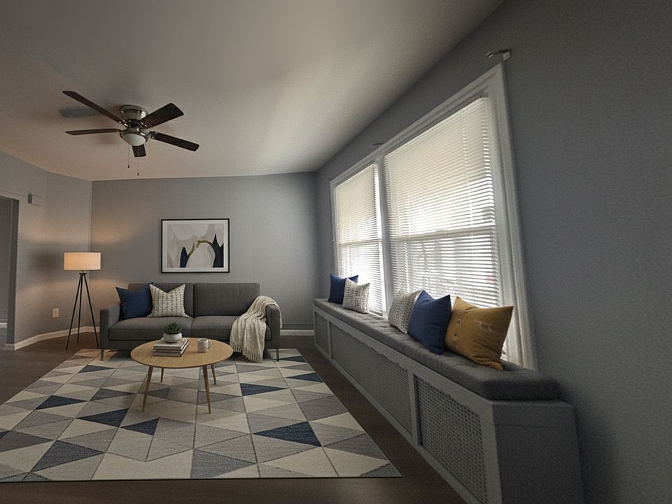 The interior is characterized by a neutral color palette, with gray walls throughout, creating a cohesive and modern ambiance. Large windows in various rooms allow for ample natural light, enhancing the sense of spaciousness. The flooring varies between rooms, with some areas featuring dark hardwood and others covered in plush carpeting.