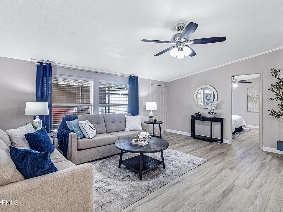 Cabinetry for storage. Fully renovated throughout, with both AC and Water Heater under 3 y/o. Enjoy NEW Countertops, Lighting, Flooring, Fresh Interior Paint, and Updated Baths, including a Custom Walk-In Shower in the Primary Suite. Step outside to a Large, Private Backyard with no neighbors behind, offering BREATHTAKING Mountain Scenery. Two spacious sheds provide Excellent Storage. Best of all, a 1yr Home Warranty and 2 Month Lot Rent Credit is included! This dreamy home is not one to miss!