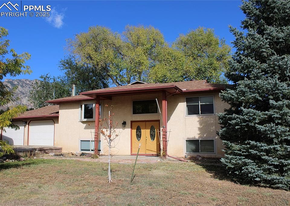 Don't miss this great escape from the city! You're in the country, but 10 minutes to town and basically across the road from Ft. Carson Gate 5. Sit on your back deck and enjoy the wildlife while taking in the fantastic views of Cheyenne Mountain. The hot tub stays with the property and is only about 3 years old, along with the propane deck heater, barbeque and portable umbrella. Perfect for outdoor parties! This 3-bed, 2-bath home is unique in that the heating is in the ceiling and each room has its own thermostat. No propane for this property. The primary bedroom has beautiful wood floors, built-ins, a nice sized walk-in closet and room for a small sitting area. The spacious family room on the lower level is perfect for gatherings with its wood burning fireplace. The kitchen will please you with beautiful granite countertops, a counter for people to sit and converse while you're cooking, soft close cabinetry and stainless appliances. There is pleny of space for RV parking, trailer parking or equipment storing along with the 2-car garage and additional carport. Evening walks are popular and stargazing is a must! Please come take a look and see for yourself.