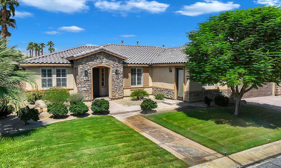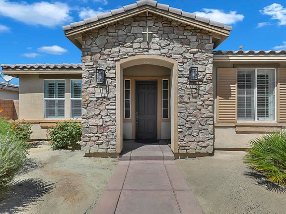 Welcome to 83402 Stagecoach Road, a desert gem tucked within the highly desirable Shadow Ranch Development. With low HOA fees, no Mello-Roos tax, and a prime location within walking distance to shops, restaurants, hiking trails, great golf, and more. From the moment you arrive home, the inviting curb appeal is captivating, the stamped-concrete walkway gracefully leads to the front door and the private casita entrance, soft ambient lighting illuminates the path, picturesque accent tones, rich stone walls, pristine desert landscaping, and a touch of lush emerald grass. Step inside your desert retreat and be greeted by nearly 2,500 square feet of thoughtfully designed living space, where natural light flows seamlessly through ivory plantation shutters adorning almost every window. The gourmet kitchen is a true centerpiece, featuring a grand granite slab island, designer countertops, an elegant stone backsplash framed with an artisan accent border, premium stainless steel appliances, a pantry, and a dedicated coffee station for your morning rituals. The open-concept living area features a decorative fireplace with a raised, tiled hearth and custom-built-ins with a granite-slab top. Additional luxuries include dual Nest digital climate controls, porcelain tile that mimics light wood flooring, a living room, a den, a formal dining room, updated baseboards, stylish ceiling fans in every room, and expansive glass closet sliders. Your primary retreat is a haven of serenity, featuring a spa-inspired waterfall shower, a private sliding door to the covered patio, and an abundance of natural light. Outdoors, the property transforms into an entertainer's paradise, with a custom DCS outdoor BBQ grill, newer 5-ton AC, an elongated covered stucco patio, matching stamped-concrete pathways, desert-inspired landscaping, and bespoke backyard lighting coming together to create the perfect ambiance. Imagine the moments ahead: gatherings under desert starlit skies, endless laughter echoing from room to room, and a lifetime of cherished memories waiting to be made, one photo album at a time.