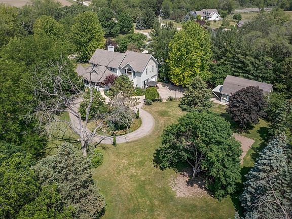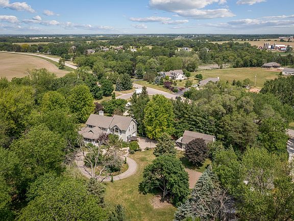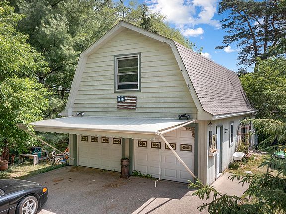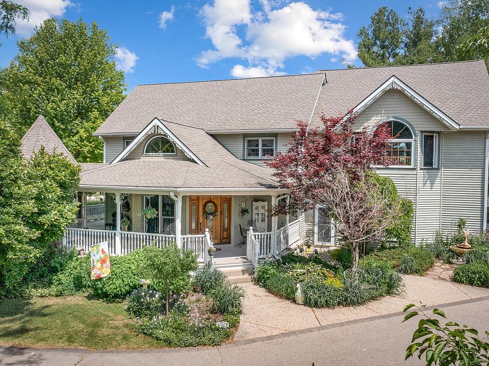 Think outside the boxed house. The front door faces south toward the interior of the tree lined yard. A covered wrap around porch skirts almost 3/4 of the house. A screened in gazebo complete with ceiling fan and light sits romantically on one corner of the porch. Enter the front door to a welcoming front room parlour with cathedral ceiling. Comfortable kitchen has an open area for your family dinners. The warmth of the wood burning fireplace in the formal dining room sets the scene for enchanting candle lit dinners or grand brunches. Built in corner cabinets will cradle your finest china or your family treasures. The bay window, flanked with floor to ceiling bookcases opposite the fireplace, is a cozy nook large enough for a loveseat! Bedroom/Den and 3/4 bath complete the first floor. There is a washer & dryer hook-up in the 2nd extra large closet. The second floor boasts a Penthouse family room with gas fireplace and built in wet bar. Looking out the bay window, complete with window seats and storage below, is comparable to seeing the world through the eyes of the Swiss Family Robinson! The second floor foyer can be a quiet sitting area or busy home office. Three bedrooms and full bath with jacuzzi compliment the second floor. A pull down stair case leads you to the 3rd floor with flooring and walking space for incredible storage. The basement is partially finished and has a great craft room/extra bedroom, which has marble floors, cabinets with sink and 1/2 bath. The heated 2 story barn has enough room for that hobby workshop or she-shed you always promised her. The second floor has enormous storage. All this on 1.48 acres of lush lawn and gardens. The vegetable garden is already planted! Just a block or two to beautiful Powers Lake.