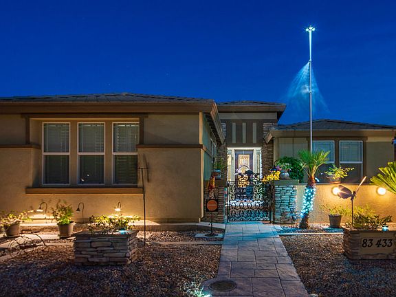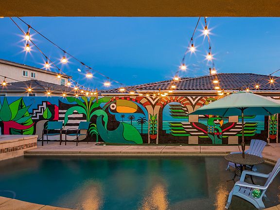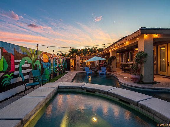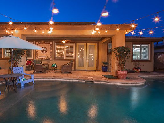 Imagine a Turks and Caicos resort transported to one of the most conveniently located neighborhoods in Indio, and you have this spectacular, one of a kind, BR / BA beauty! FULLY PAID SOLAR WITH FULL PRICE OFFER! Located within the gated community of Shadow Ranch, this home has an AMAZING back yard with swimming pool, spa, slide, outdoor bar, sun tan area, covered porch, covered entertainer's area with food prep set-up that makes for amazing memories! The home is all grand in scale with coffered ceilings, crown molding, Plantation shutters and elegant custom touches throughout and 8 ft interior and exterior doors with custom hardware. The master suite is a 5 star retreat with private doors to pool area, a large walk-in closet, dual vanities, step in shower and tub; 4 other bedrooms are spread throughout the home - one currently used as an artist's studio. Formal dining, an open concept kitchen / breakfast area / living room are the heart of the home with deluxe built-in's. The kitchen has a big island, stainless steel appliances. From the front gated entrance to the custom mural on the back wall, everything about this home says ''Enjoy Life!''