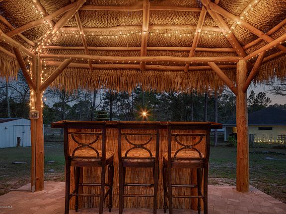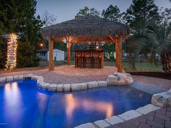 Resort style tropical oasis right in your own backyard! Stunning 3/2/2 contemporary home sits on over an acre in The Royal Highlands with no build behind. Incredible outdoor space is sure to please, featuring a fabulous walk in lagoon pool with 6 ft waterfall,lounging deck and slide. Soak up the sun and relax in the sandy beach area or cool off in the sparkling clean, refreshing water. Entertaining is a breeze at the custom built pool side tiki bar or gathering around the fire-pit stargazing on those cooler evenings. Beyond the pool area to the rear of the property are large cypress trees which act as a natural repellent keeping the mosquito's away while you play. All within a fully fenced yard. Interior is just as nice! Walk through the front double door entry, notice how crisp & clean. Vaulted ceilings recently retextured, walls freshly painted, truly a move in ready home. Huge windows allow natural light to pour in and shine on the beautiful new tile plank flooring throughout. Updated kitchen with granite counter tops, nearly new stainless steel appliances still under warranty. Enjoy meals at the kitchen nook, the breakfast bar or the formal dining area. Large pantry and inside laundry room with new washer & dryer. Master bedroom suite has double sinks, garden tub, separate shower, and a large walk in designer closet with built ins. Master bedroom and living room have sliders to the large screened in porch with great view of the pool. 2nd bath also functions as pool bath so no wet feet though the house. No HOA to get in the way. Bring the toys & enjoy Florida Living
