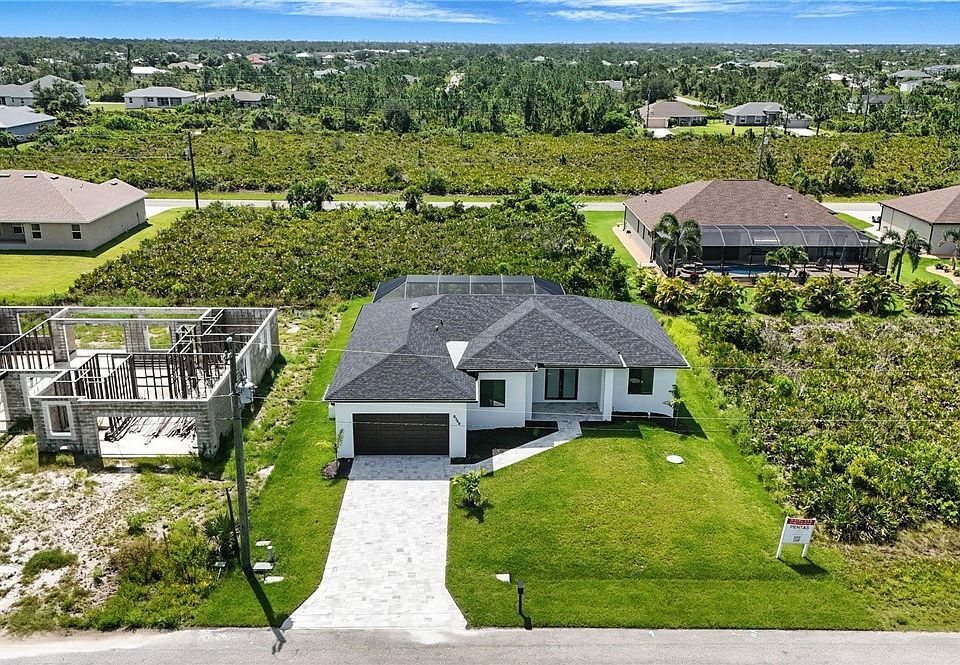 Brand new 3-bedroom + den, 2-bath home offers 1,726 square feet of upscale living space. Located in a quiet and growing neighborhood of Port Charlotte, the home features an open-concept layout, stylish finishes, porcelain tile throughout, quartz counter tops and high ceilings. The split-bedroom design provides privacy, while the covered lanai and private pool offer a perfect space for outdoor enjoyment. Built with impact-resistant doors and windows. Ideal for full-time living or investment.