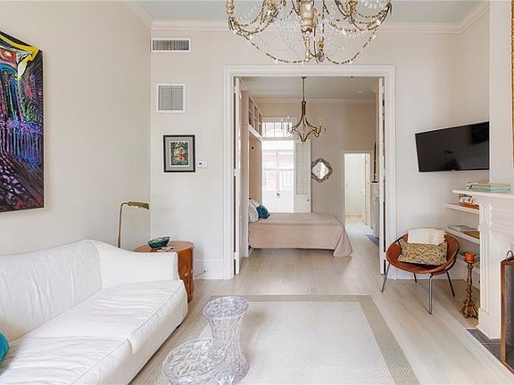 Tucked within this historic masterpiece lies a one-bedroom sanctuary. Stately. Serene. A space that breathes with the rhythm of history, yet offers the luxuries of today. A custom Murphy bed folds away as if by sleight of hand, offering space when you need it, elegance when you don't. French doors swing open to a courtyard where aged brick and lively greenery conspire in hushed conversation.