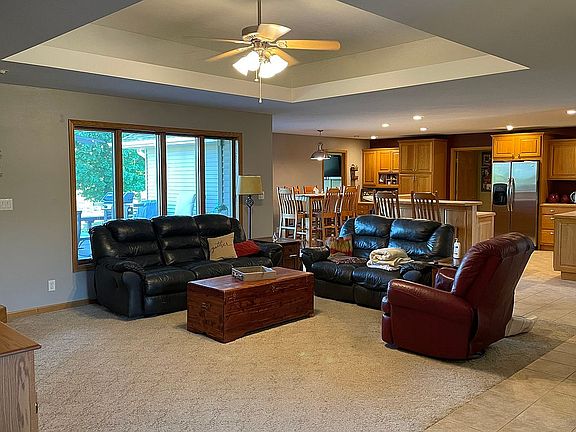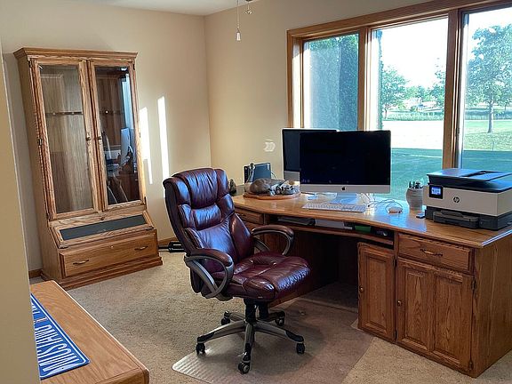 Large open floor plan perfect for entertaining and families. Master suite, 2 bedrooms, full bath, office, formal dining, family room, large kitchen and laundry/mud room on main level. 1750 sq feet of finished living space in lower level includes 2 additional bedrooms, full bath, family room and storage area. One additional room is partially finished and could be used as a 6th bedroom. Large wood deck faces south with beautiful view of hole 7 on Fox Ridge Golf Course. Over-sized 3 stall garage with separate access to basement. Nice sized back yard with sprinkler system. New roof in fall of 2020.