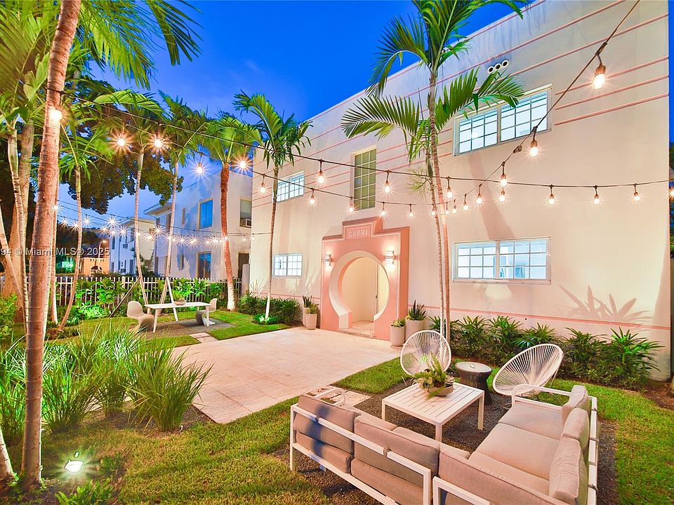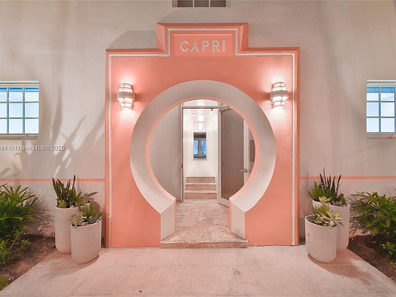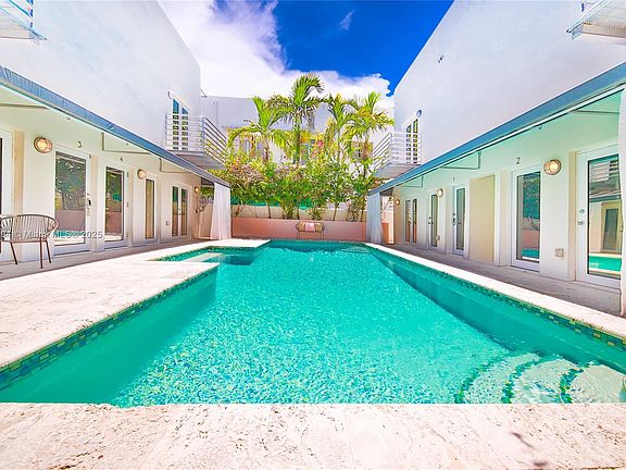 Vintage Deco charm meets modern luxury at the recently remodeled Capri South Beach, a 4-unit townhouse community w a private & serene pool courtyard. This fully designer furnished two-story townhouse is completely renovated w chic upgrades, including: bright gourmet kitchen w SS appliances & quartz countertops, remodeled bathrooms, custom closet built-ins, light porcelain wood tile flooring, and a spacious custom workspace. Large primary has French doors leading to a charming balcony. Enjoy sunny days and cool evenings on your covered veranda overlooking the pool. Gated & secured parking in the rear and secured front entry with video intercom system. The very best in SoBe living with the space of a house & the convenience of a tropical urban apartment!