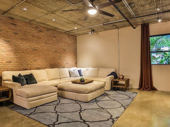 Incredible unit at the sought after Masonic Temple Lofts! Rare ground floor patio unit with an enormous private outdoor space. South tower loft with polished concrete floors, high ceilings, 2nd bedroom area with closet, built-in master closets and incredible hand-laid, real brick veneer wall. Enjoy summer evenings on your private outdoor patio under the built-in pergola providing shade, under the cafe lights and twinkling lanterns. This space is perfect for indoor/outdoor living and entertaining! Separate guest entrance for the bathroom provides privacy from the master bedroom, updated bathroom with dual vanity maximizes space and function. Central AC and heat, ample in-unit storage and offsite storage in the building, secured parking, community fitness center, BBQ area and guest parking.
