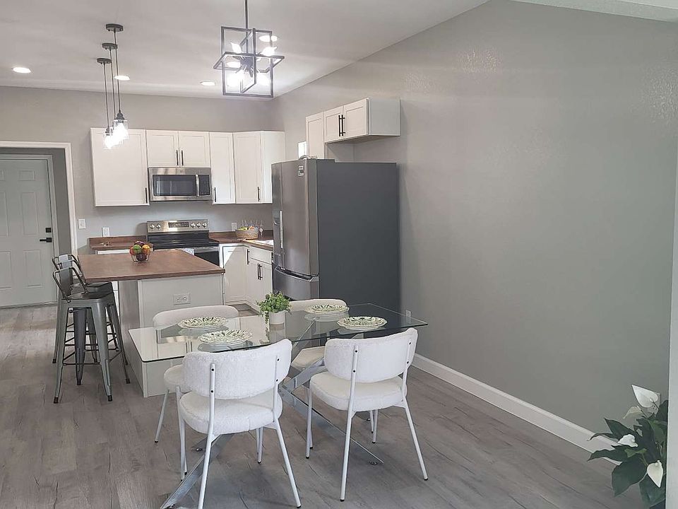 Step into modern living with this brand-new 2025 build, featuring 3 bedrooms, 2 bathrooms, and a desirable split floor plan for added privacy. Nestled on a middle lot between two other newly constructed homes, this property offers a sense of community while maintaining its own charm. Located on a newly paved side street within city limits, you’ll enjoy convenient access to town without the noise and congestion of heavy traffic. Inside, the kitchen shines with butcher block countertops and comes fully equipped with stainless steel appliances—microwave, stove, refrigerator, and dishwasher. Durable vinyl plank waterproof flooring flows throughout, combining style with low-maintenance living. This move-in-ready home balances city convenience with a quiet neighborhood feel.