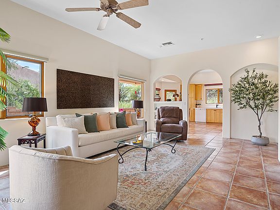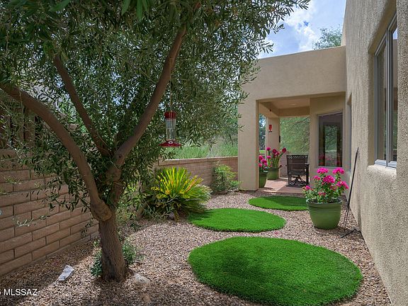 Embrace the serenity and leisure of retirement living at its finest, nestled in an excellent golf course setting designed exclusively for the active retiree. This charming 2-bedroom, 2-bathroom home offers an idyllic blend of comfort and style, beginning with an inviting Mexican tile courtyard that gracefully opens to an expansive, verdant side yard adorned with lush artificial turf--perfect for effortless outdoor enjoyment without the hassle of maintenance. Step inside to find 10-foot ceilings, arched passageways, and brilliant white walls that amplify the natural light flowing through wood-clad Anderson windows. The heart of the home, a spacious kitchen, boasts a generous array of cabinets and a quaint eating area framed by oversized windows that showcase captivating views of the surrounding desert flora. Elegance is in the details with solid wood doors and southwest tile floors that exude a timeless appeal. Step outside to the covered patio, where you can unwind under the majestic canopy of towering mesquite trees, creating an ideal sanctuary for peaceful afternoons filled with relaxation. This gem is tucked within a secure, gated community, complete with private pool and spa amenities, as well as access to all the exclusive offerings of Green Valley Recreation. Indulge in a lifestyle where every day feels like a getaway. This home may be cozy in size, but it's grand in its potential to create your perfect retirement oasis.