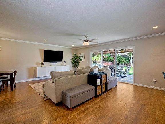 Welcome to this beautifully upgraded 3-bedroom, 2-bathroom home, where modern living meets comfort and style. Recently enhanced with a solar system and a newer roof, this home is designed for energy efficiency and peace of mind. The open-concept kitchen flows seamlessly into the family and living areas, making it perfect for family gatherings and entertaining. The kitchen boasts granite countertops, stainless steel appliances, and plenty of cabinet space, including a wine cooler for all your culinary needs. Step outside to your private backyard oasis, complete with a lawn, built-in BBQ, and a pergola that offers shade and relaxation. Kids will love the playset, while the outdoor space is perfect for hosting or simply enjoying the fresh air. Inside, you'll find dual pane windows, crown molding, recessed lighting, ceiling fans, and fully updated bathrooms, adding to the home’s stylish and functional appeal. With A/C, a two-car garage, and no Mello-Roos or monthly fees, this move-in-ready home is set on a peaceful lot, providing both tranquility and convenience. Don't miss the opportunity to make this immaculate property your own!