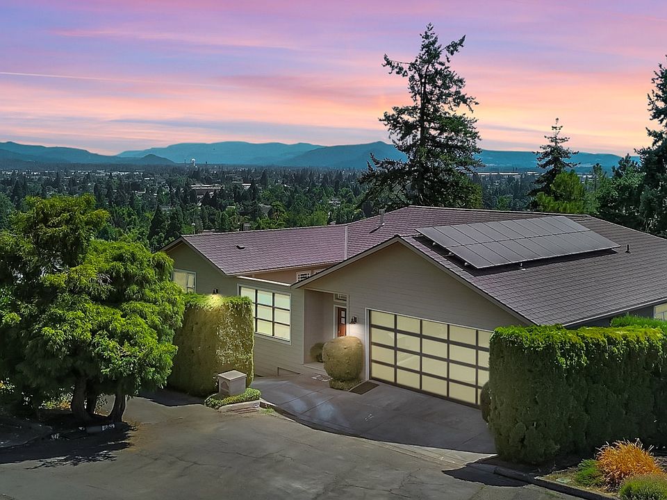 This distinguished contemporary residence, built in 2005, spans 2 floors with 3,8773 sq. ft. of beautifully finished living space. Located on a .22 acres lot with unmatched valley views from a covered patio and separate deck, this 4 bedroom/4 bath plus 2 convenient half-baths blends spacious living with refined design features. Vaulted ceilings, expansive windows, and panoramic views create a luminous, modern atmosphere. The gourmet kitchen is equipped with granite countertops, built-in gas appliances, a wine refrigerator, and instant hot water-perfect for culinary enthusiasts. Environmentally friendly features with solar panels, and an electric charging station in the garage! The main level of the home has the living room/dining room, large primary ensuite, kitchen and laundry as well as 2 half baths. The primary suite has a step in shower, soaking tub and walk-in closet. The two car extra deep garage on the same level makes life one-level easier!. On the lower floor, there are three more bedrooms plus a den, family room with fireplace, and media room; two of the bedrooms are also ensuites with their own bath. The second garage is below in the basement of the home. So much to see! Make an appointment today!!