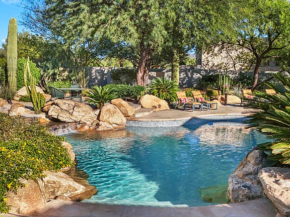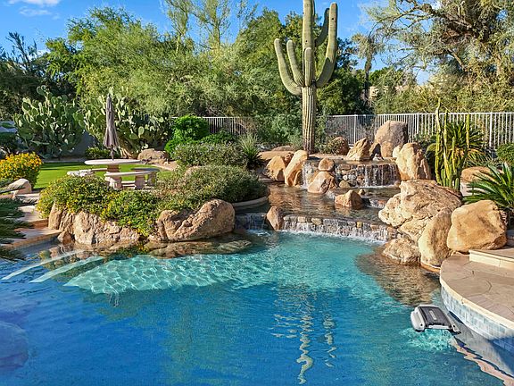 Discover a truly Spectacular residence nestled within the prestigious, GUARD GATED GOLF community of Pinnacle Peak Country Club. Located in the heart of North Scottsdale, this exceptional home blends Refined Luxury with effortless Indoor-Outdoor living. Offering a Breathtaking Backyard Oasis, surrounded by serene, mature landscaping, sparkling pools, spa, tranquil water ponds and soothing water fountain features. Expansive lounging areas create the perfect setting for Relaxation & Entertaining, all set against the backdrop of Arizona's stunning Desert Beauty. Inside, the Custom Culinary Chef's Kitchen will impress all with top-tier finishes and thoughtful design. Enjoy a Seamless flow with the Kitchen-Family room Great room, boasting a large wet bar. The generous counters and ample seating are ideal for special gatherings of any size. All Chef's & food tasters are welcome within the spacious Great Room.