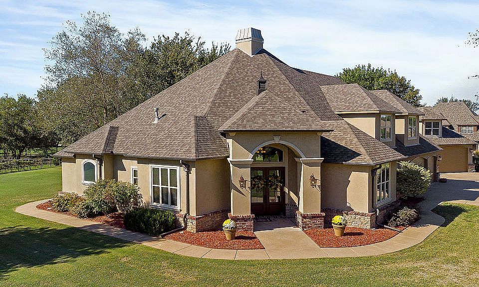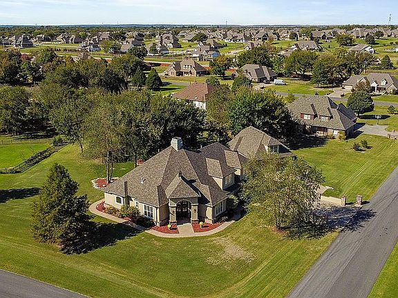 Owasso Custom Home with Detached Shop on .93 Acres. One-of-a-Kind Property You Don’t Want to Miss! Welcome to this stunning custom stucco, brick & stacked-stone home with shop perfectly situated on a .93-acre corner lot in Owasso. Designed with space, craftsmanship, & functionality in mind. Step through the front door of this beautiful home into a grand entryway with 14’ ceilings opening into the two-story living room boasting 19’ ceilings, impressive 12” crown molding, hardwood floors, fireplace, surround sound, & floor to ceiling walls of windows overlooking the huge backyard with mature trees, large patio & outdoor fireplace – perfect for entertaining or relaxing. You will love cooking & entertaining in the spacious kitchen with a roomy eating area. The gourmet-inspired kitchen features granite countertops, an abundance of custom cabinets, commercial-grade Five Star range, pot filler & large island with storage & prep space. Two large walk-in pantries plus a butler’s pantry with wine fridge connecting to the formal dining room. The primary suite is conveniently located on the main floor & features a tray ceiling extensive crown molding, large walk-in closet, & spa-like bath with whirlpool tub & walk-in shower. Upstairs, you’ll find a full bath, four bedrooms, three with walk-in closets. The largest bedroom on the second floor can serve as a flex/game room.