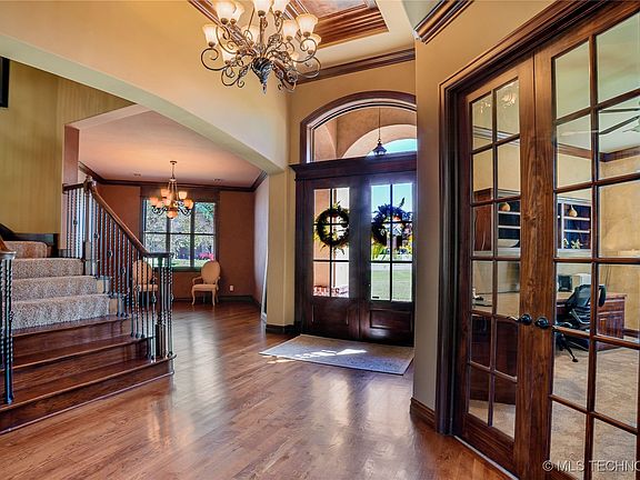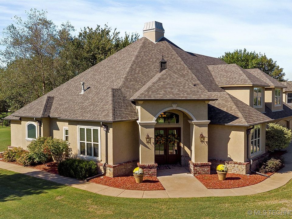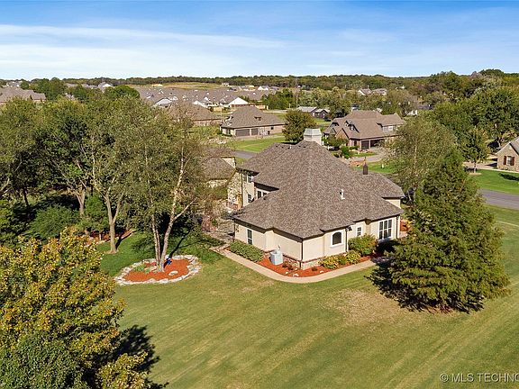 Owasso Custom Home with Shop on .93 Acres. One-of-a-Kind Property You Don’t Want to Miss! Welcome to this stunning custom stucco, brick & stacked-stone home with shop perfectly situated on a .93-acre corner lot in Owasso. Designed with space, craftmanship, & functionality in mind. Step through the front door of this beautiful home into a grand entryway with 14’ ceilings opening into the two-story living room boasting 19’ ceilings, impressive 12” crown molding, hardwood floors, fireplace, surround sound, & floor to ceiling walls of windows overlooking the huge backyard with mature trees, large patio & outdoor fireplace – perfect for entertaining or relaxing. You will love cooking & entertaining in the spacious kitchen with a roomy eating area. The gourmet-inspired kitchen features granite countertops, an abundance of custom cabinets, commercial-grade Five Star range, pot filler & large island with storage & prep space. Two large walk-in pantries plus a butler’s pantry with wine fridge connecting to the formal dining room. The primary suite is conveniently located on the main floor & features a tray ceiling extensive crown molding, large walk-in closet, & spa-like bath with whirlpool tub & walk-in shower. Upstairs, you’ll find a full bath, four bedrooms, three with walk-in closets. The largest bedroom on the second floor can serve as a flex/game room. The impressive 32 X 40 upgraded 2 story shop is a rare find! The first-floor features 10’ ceilings, heat, AC & plumbing. The 2nd floor offers 525 sq ft of storage space – ready to convert into office space, studio or deluxe man cave. The shop is perfect for a car enthusiast, hobbyist or anyone needing extra workspace. Shop was custom built to match the exterior of the beautiful main home. Additional Features: Large office with French doors & built-in desks. Large laundry room with deep sink, custom cabinets, & storage closet. Central vacuum system. Full sprinkler system covering the entire lot. Owasso Schools