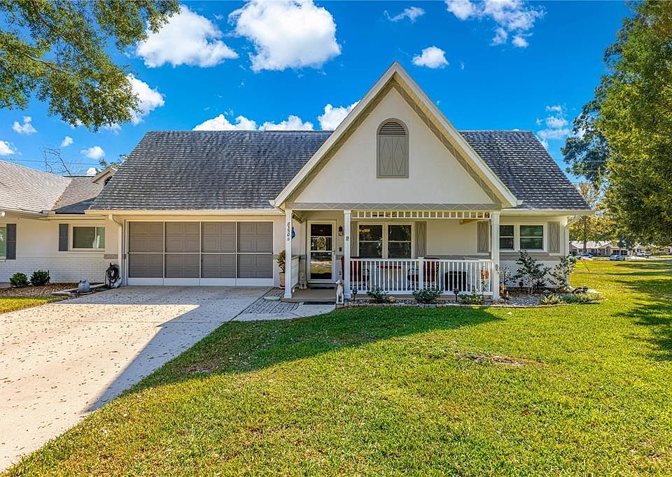You don't want to miss this spacious 2 bed, 2 bath, 2 car home located in the prestigious 55+ community of On Top of the World. This Montgomery unit invites you to enjoy watching the world go by on your spacious front porch on the pretty tree-lined street. Enter into the living room/dining room combo featuring wood look laminate flooring. Into the kitchen we have updated dark stainless appliances, some pullouts in the lower cabinets, updated lighting, refaced cabinets with new doors and newer hardware. The interior of the home was freshly painted in 2021. Primary bedroom is spacious with a large walk-in closet . The primary bath has an updated- tiled, walk-in shower, updated vanity and commode. Including a new fixture. Newer HVAC, Roof replaced in 2018. There is an additional 162 ft of living space with the enclosed Florida room under A/C. And an additional screened area for those nice fall days. Other add ons include: Extra insulation in the attic, gutters, insulated garage door, new garage door opener, washer & dryer convey & gutters. This home is move in ready! Call for your appointment to view today.