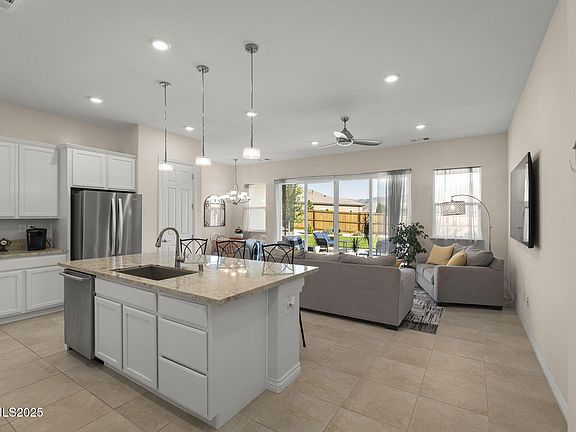 Welcome to your new home in a prestigious newer community where elegance, comfort, and Nevada's scenic beauty come together. This exceptional single-story home is perfectly positioned on a large lot, offering a lifestyle defined by space, style, and stunning views. From the moment you step inside, soaring 10' ceilings, 8' doors, and rich two-tone paint create a grand yet inviting atmosphere. The open-concept layout flows effortlessly, anchored by an entertainer's kitchen that will delight any chef. Here, you'll find gleaming granite countertops, stainless steel appliances—including a built-in oven, microwave, and gas cooktop with pot filler—42" upper soft-close cabinets, and abundant prep and storage space. A large center island with pendant lighting doubles as a gathering spot for family and friends. The adjoining great room is bright and spacious, featuring expansive windows that frame picturesque views and flood the space with natural light. Oversized sliding glass doors lead to a covered patio and a backyard with endless possibilities—perfect for al fresco dining, summer barbecues, or simply relaxing as the sun dips behind the mountains. The private primary suite offers a peaceful retreat, complete with a luxurious bath showcasing granite vanities, dual sinks, a soaking tub with a view, a walk-in shower, and a generous walk-in closet. Additional bedrooms are equally spacious, each with walk-in closets, and are served by beautifully appointed baths with granite surrounds. A versatile laundry room with ample cabinetry adds convenience and organization. Additional highlights include elegant tile flooring in main living areas; Walk-in pantry and multiple storage options; Energy-efficient construction and finishes; Professionally landscaped front yard with lush green lawn and paver driveway. Whether hosting lively gatherings, enjoying peaceful mornings with coffee on the patio, or soaking in Reno's incredible sunsets, this home offers the perfect blend of comfort, sophistication, and lifestyle. Schedule your private tour today and experience all that this community has to offer.