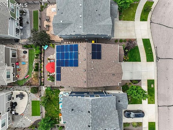 2 Story home w/Pikes Peak views located in Banning Lewis Ranch! As you drive up to this home, you're welcomed with lush landscaping and an inviting front porch. Step inside to a large foyer which flows into a bright & airy floor plan. The spacious great room features clerestory windows, 9ft tray ceilings and wood laminate floors throughout. The kitchen opens up to the living room, providing great points of connection in this open concept floor plan. Kitchen features include a large island w/breakfast bar, LG Smart stainless steel refrigerator, oak cabinets and walk-in pantry. Experience seamless indoor/outdoor living and entertainment, as the dining area provides walkout access to the extended composite deck. Furthermore, this home provides the luxury of a fenced low maintenance (xeriscaped) backyard. As you journey upstairs, you'll find the primary suite with ample natural light, tray ceiling, ceiling fan and adjoining bathroom. Primary bathroom features a double vanity, walk-in spa shower, and large walk-in closet w/built-in shelves. Perfectly framed Pikes Peak views can be enjoyed from the loft on the upper level which makes a great space for an exercise, play or media room. Two additional bedrooms, both with mounted ceiling fans, spacious closets and a shared full bathroom are also located on the upper level. The laundry room is conveniently located down the hall from the two bedrooms. Access to and from the garage also includes a little mud/room and is found just off the kitchen on the main level. The finished and insulated 2 car garage is especially nice in the winter months. Active Solar Panels installed in 2020 significantly decrease monthly utilities, saving you lots of money! Banning Lewis Ranch, is known for its community amenities which include a Recreation Center, Two Pools, splash pad, pickle ball courts, Gym, Dog Park, Over 50 Acres of Trails & Parks! Don't miss this hidden gem it will not last long, call for your private showing today!