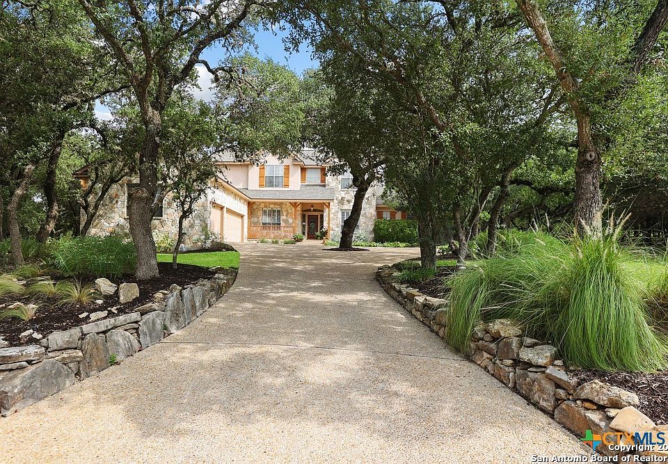 welcomes to a side-entry 3-car garage and extra parking. Wander out back to relax on covered patio and survey the park-like, landscaped backyard featuring a large Keith Zars custom pool (recently resurfaced!), and enclosed with wrought iron fencing. But that's not all! Come sit beneath the gorgeous grove of oaks at the side of the house and explore the back part of the property - also fenced with wrought iron and the perfect place to kick a soccer ball, install a treehouse or run and play hide and & seek! The perfect feel of the Hill Country yet conveniently located near all the fun amenities (The Rim, La Cantera, The Rock, Leon Springs) AND with access to the highly-rated Boerne schools! Inside discover impeccable maintenance, large rooms, high ceilings with custom treatments and on-trend recent paint - a perfect palette. Upstairs are 3 very spacious secondary bedrooms and baths and a large game room. Look inside the closets for storage galore both conditioned air and