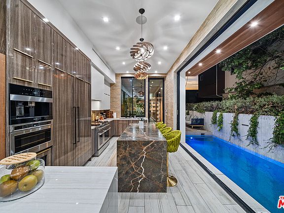 Presenting the iconic "Maya, Lady of Botanica," one of three newly built "Glass Ladies Houses" by acclaimed designer Alon Zakoot. This tropical zen Tulum-inspired trophy property, has been featured in over fifty publications globally, and is known for its harmonious blend of tropical jungle elements and botanical accents. Step into Maya's realm, where she seamlessly transports you to a world of natural beauty and tranquility. Upon arrival, prepare to be captivated by the grandeur of the towering glass-and-steel entrance, complemented by sloped overhead lines and meticulously curated drought-tolerant flora. The living room features a decadent fireplace, shimmering accent wall, and sliding glass doors that open onto the enchanting patio and walls of glass onlooking the sparkling saltwater pool and spa.The masterfully designed kitchen boasts a double-waterfall island, state-of-the-art appliances, custom cabinetry, and a convenient pass-through to sparkling saltwater pool and spa and the main-level indoor/outdoor lounge, complete with fire pit and additional bar seating. The dining room is adorned with a staircase-turned-art-piece. Ascend to the upper level, where the primary suite awaits, offering a private balcony with stunning views, a floating dual-sink vanity, rainwater shower, separate tub, and a brilliant clerestory window framing vistas of mature palms. The additional bedrooms and bathrooms showcase the finest fixtures and finishes, ensuring a luxurious living experience. Upstairs awaits a stunning rooftop deck with an outdoor kitchen, dining area, lounge furniture and oversized firepit. The rooftop features breathtaking 360-degree views of the cityscape, mountains, downtown Los Angeles and beyond. Descend to the lower level, where a junior primary suite awaits, featuring its own fireplace and an exceptional outdoor living room adorned with a botanical wall and open-air elegance. On this level you will also find a beautiful theater, equipped with a built-in mini bar and blackout shades, as well as an atrium letting in natural elements and light, and an additional guest suite. Maya, Lady of Botanica stands as an extraordinary architectural feat, presenting a rare opportunity to own a slice of tropical Tulum paradise in Silicon Beach. Conveniently located blocks from the best shopping, nightlife and entertainment Venice has to offer on Abbott Kinney and Rose Ave, and moments from the beach, this residence epitomizes a seamless blend of luxury living and Venice lifestyle.