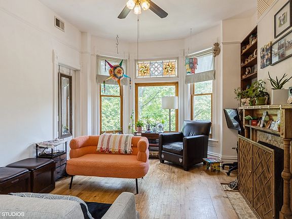 Welcome to this second-floor, character-rich 3-bedroom, 1-bath Evanston condo with separate entryway and stairs in a rare historic 5-unit building. This south-facing unit is filled with natural light and full of vintage charm -- featuring original hardwood floors (except kitchen), 10-foot ceilings, crown molding, and a beautifully detailed fireplace. A stained-glass window adds even more character to the living area. Central air, large storage space, shared backyard, and assigned garage parking spot included. Shared laundry in the basement with the option to install in-unit. Prime location near both the Main Street shopping and dining, CTA, Metra, Robert Crown Center, parks and much more. Pets allowed with limitations.