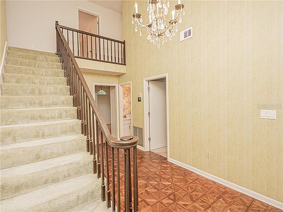 Back on market financing fell through. Oh my goodness! What a great 4 bedroom, 2.5 bath brick, pool home. Master bedroom is downstairs, with 3 bedrooms upstairs PLUS 2 finished attic rooms that could be used as extra bedrooms, storage, game room, ect.. This home features a very open floor plan for family fun and entertaining. A great home to enjoy the Florida lifestyle. This home sits on a large manicured lot with a side entrance garage, new A/C, and so much more. Do not miss out on this lovely home.