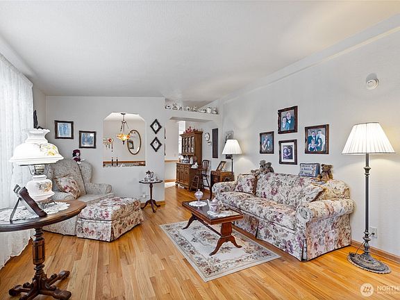 Welcome to the desirable 55+ community of Mountain View Estates! This charming home is situated in the back of the park so it is quiet & peaceful. Beautiful updates & details throughout whole home. Walk into the family room with gorgeous real Oakwood floors. Formal dining room leads to kitchen with stunning backsplash. All appliances stay with home! Mud room with sink & extra fridge off of utility room leading to the back door. Spacious living room with sliding glass door to HUGE back deck perfect for Summer BBQs. 2 good-sized bedrooms & guest bath off of living area. Oversized Primary bedroom on opposite side of home with walk in closet & separate primary bath. Workshop & covered parking outside. Come fall in love with this amazing home!