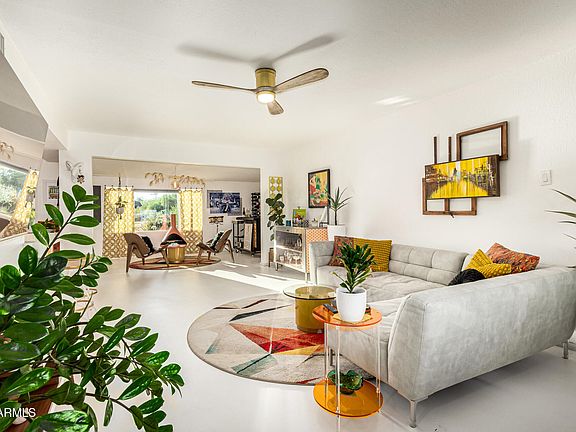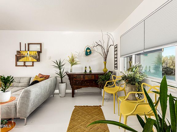 Nestled in a sought-after golf community, this charming mid century modern home is a desert gem! Palm trees greet you, along with a welcoming front patio & 2-car garage. The immaculate interior boasts open common areas flowing seamlessly into the nice-sized family room. Discover abundant natural light, neutral color tones, & elegant light fixtures enhancing the inviting atmosphere. Galley eat-in kitchen has a breakfast bar, quartz counters, SS appliances, & white cabinets. The main bedroom offers a private bathroom featuring a dual sink vanity & tiled shower. Backyard oasis enjoys stunning sunset views while overlooking the golf course, synthetic grass areas, desert landscaping, serene ponds with water features, & a covered patio. Resort-style living in an unbeatable golf course setting Upgrades and Features in this mid-century modern home include: