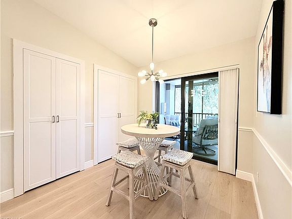 Absolutely gorgeous move in ready Veranda located in Naples Heritage Golf and Country Club!!! Unbelievable price - turnkey!!! 2 BR +DEN / 2 Bath Condo with Garage. This bright & beautifully furnished condo is ready for new owners. Situated on a quiet street within walking distance to clubhouse. You'll fall in love immediately upon entry. Luxury vinyl plank flooring runs throughout condo with vaulted ceilings in main living area & primary BR. Interior is light and bright. Kitchen updates include white shaker cabinets, quartz countertops, custom tile backsplash, designer lighting & SS appliances. Kitchen has breakfast/eat in area with double pantry (shaker doors on pantries match cabinetry). Dining room and living room are open concept with bar. Den is located just off main living area. Pocket doors allow den to be closed off for privacy and used as 3rd BR (has Murphy Bed) or home office when needed. Spacious primary BR w/ 2 walk-in closets & bay window with sitting area. Primary bath has been entirely remodeled with top finishes. Primary BR split from guest BR for added privacy. Pocket door allows homeowner to create private bedroom and bath suite for guest. Enjoy relaxing and entertaining on both front and back screened lanais. Sliders from living room exit onto back lanai with view of golf and preserve. Sliders from breakfast/eat in exit to front lanai with view of courtyard. NEW HVAC, PGT IMPACT WINDOWS and SLIDERS, NEW LANAIS front and back. This is a MUST SEE Condo at a don't miss out of price. Naples Heritage is bundle golf community with 18 hole golf course, driving range, putting green, resort style pool w/ cabana, tennis pavilion, fitness center, pickleball courts & bocce ball. Just minutes to downtown Naples and beaches. Come live the Naples Heritage lifestyle.