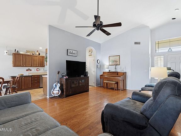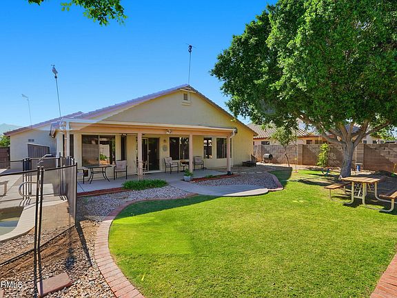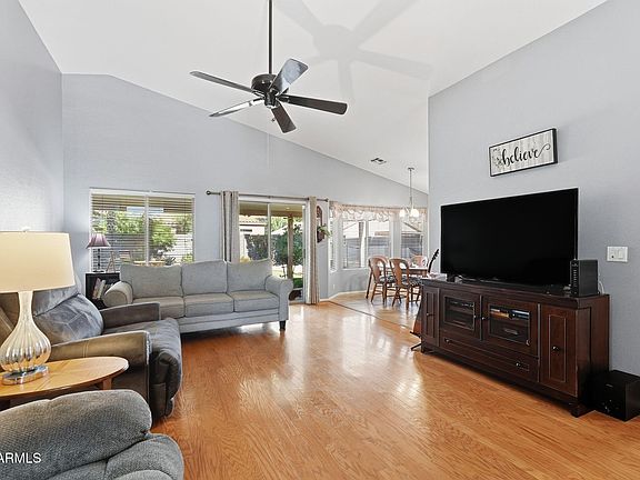 Welcome to this charming and meticulously maintained property in a prime location! Step inside and be greeted by vaulted ceilings for a spacious feel. The heart of the home, the family room, features beautiful wood floors, creating a warm and inviting atmosphere. The kitchen is both functional and stylish, boasting sleek Corian countertops and ample cabinet space. The spacious owner's suite offers a delightful bay window for abundant natural light. The adjoining bath features dual sinks and a generous walk-in closet, providing a private oasis. Enjoy the Arizona lifestyle in your large backyard, complete with a stunning, mature shade tree offering relief from the summer sun. The large covered patio is ideal for outdoor dining, and the refreshing small play pool is perfect for a quick dip! This home provides exceptional storage, including an extra utility room inside and multiple sheds outside. Car enthusiasts and DIYers will appreciate the 3-car garage which comes equipped with a handy workbench and plenty of room for vehicles and tools. Sitting in a prime location, less than 2 miles away from Westgate Entertainment district, State Farm Stadium and soon-to-open VAI Resort!