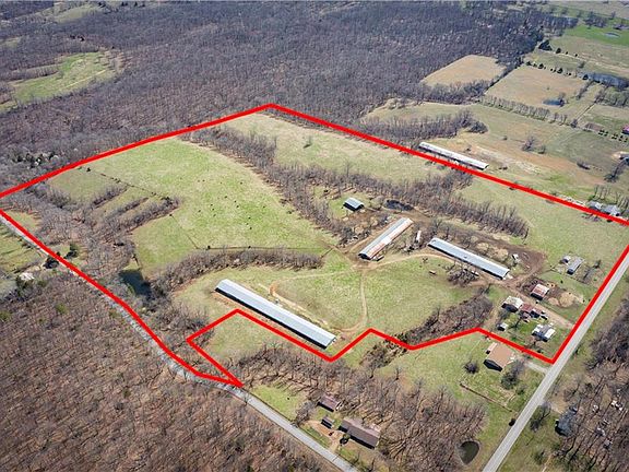 53 Acre m/l cattle farm (and former chicken farm) with ponds, live springs, open pasture, rolling hills, enough wooded acreage for wild game. This is a great farm on paved road, City water, natural gas, convenient to town. There are still two pole chicken houses and one truss chicken house remaining. The chicken houses make great hay barns or could be used for storage, pipe coral for working cattle, a work shop, implement shed and so much more. There is a older 2 story farm house 3 bed 1 bath and other various outbuildings.