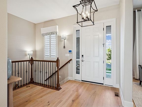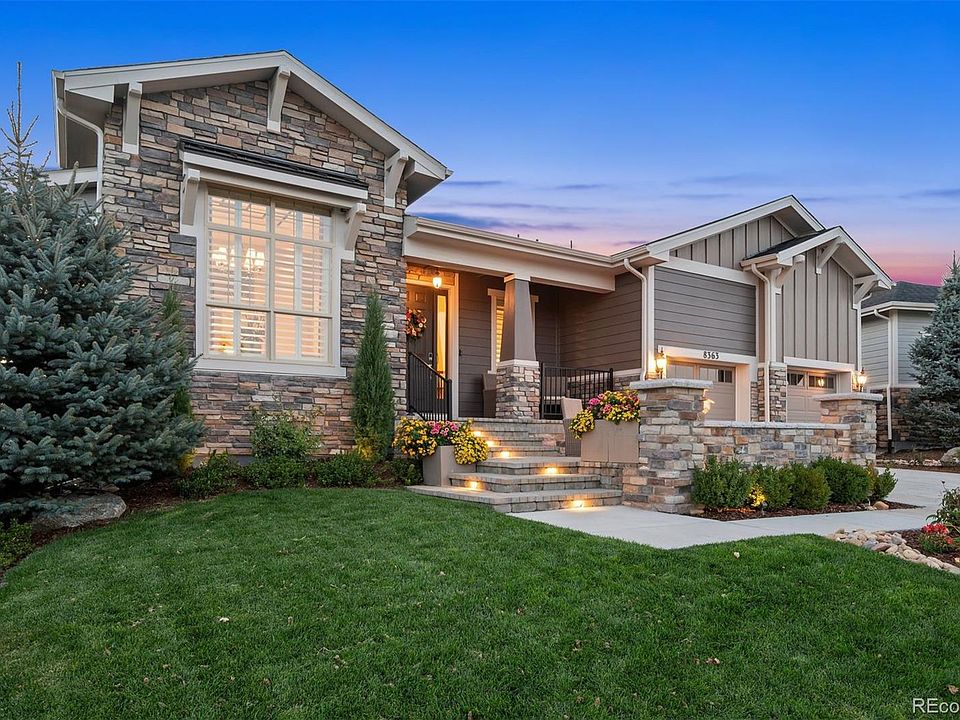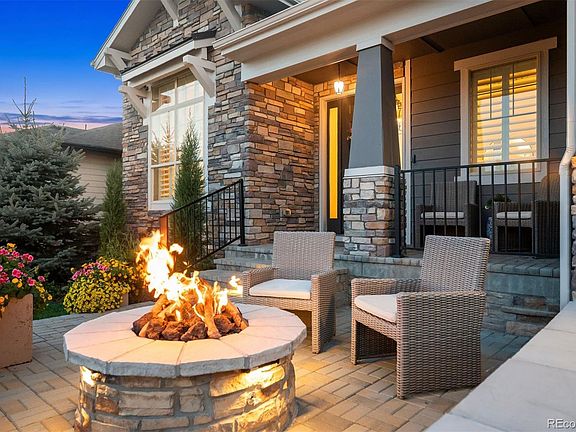 Welcome to elevated living at its finest. This former Toll Brothers Bancroft model home in the prestigious 55+ Hilltop at Inspiration community captures panoramic 180-degree mountain views and delivers a lifestyle of sophistication, comfort, and ease. Perfectly positioned on a quiet cul-de-sac backing to a greenbelt, the home showcases professionally landscaped grounds, a stone-accented front patio, and elegant exterior lighting—every detail designed for Colorado luxury living. Originally built with over $300K in Toll Brothers design upgrades, the seller has enhanced the home with an additional $290K in curated improvements, creating a residence that truly exceeds new construction. Seller Enhancements Include: Miele dishwasher, new fencing, epoxy-coated garage floor, tankless water heater, front fire pit and backyard wall, solar panels, custom bedroom shutters, upstairs interior paint, upgraded Twin Pine outdoor grill, Monogram gas cooktop, new roof (2024), a professionally finished basement, and a complete HVAC upgrade including humidifier, air filtration, and duct cleaning. Step inside to discover 4,367 sq ft of refined living space with 10’ ceilings, engineered hardwood flooring, and floor-to-ceiling stacking glass doors framing those breathtaking mountain views. The great room, dining area with stone accent wall, and private study with custom built-ins create a perfect balance of sophistication and comfort. The primary suite is a private retreat with deck access, serene mountain vistas, and a spa-inspired five-piece bath. Luxury finishes include slab granite countertops, KitchenAid and Dacor appliances, Visual Comfort lighting, plantation shutters, motorized blinds, surround sound, and Control4 smart home wiring. Outdoor living shines with a covered deck, lower patio, custom grill station, and private putting green, ideal for sunset entertaining. A true gem of a property! Schedule your private tour today.