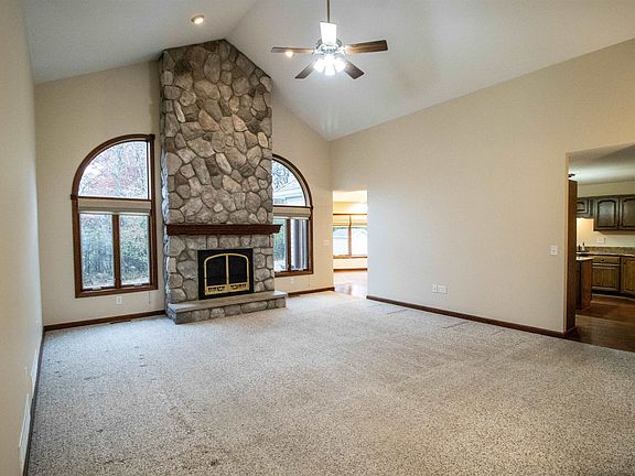 Welcome home to this stunning modern ranch in Goodrich, built in 2007 and beautifully maintained with quality construction and thoughtful design throughout. The open-concept great room features cathedral ceilings and an electric fireplace, creating a warm and inviting atmosphere. The spacious LaFata kitchen includes granite countertops, double convection ovens, a large pantry, and ample cabinet storage. The main level offers four bedrooms (or three plus an office) and four full baths, including a luxurious primary suite with a soaker tub, towel warmer, and walk-in closet. Enjoy the convenience of first-floor laundry with a washtub and solid wood doors throughout. The walkout basement with 9-ft ceilings provides incredible versatility, featuring a wood-burning fireplace, space for a pool table (included), and plumbing for a future wet bar, plus three additional potential bedrooms. Quality-built with 2x6 construction, R19 and R38 insulation, Pella casement windows, and I-joist floor systems for minimal noise transfer. Additional highlights include a central vacuum system with kitchen dustpan, sprinkler system, 12x12 storage shed, firepit area, and frequent visits from local wildlife. The oversized 28x35 insulated garage offers pull-through access for added convenience. A perfect combination of modern amenities, craftsmanship, and peaceful surroundings—this home is a must-see!