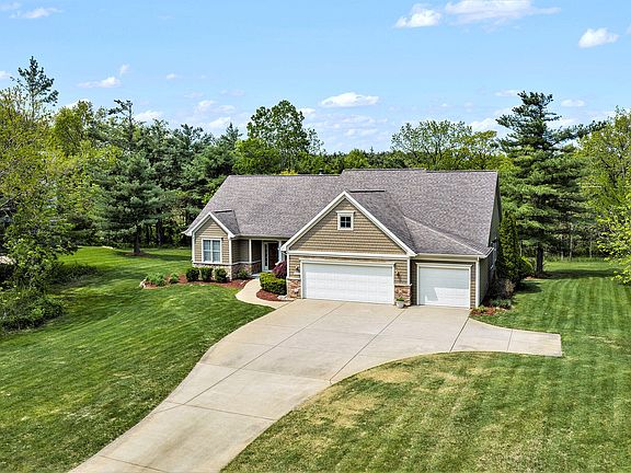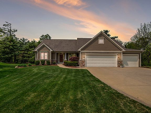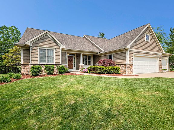 ACCEPTED OFFER - Exceptional and rare 4,200 sq. ft. ranch-style home by American Village Builders located on a private .9-acre lot in Barrington Shores. From the moment you walk in, you will notice the quality of the home with its open layout, comfortable living spaces and lovely design details throughout. The living room has vaulted ceilings, fireplace and large windows that bring in natural light. The well appointed chef's kitchen has granite counters, island for food preparation, custom cabinets, breakfast bar, pantry, and stainless appliances. The kitchen flows nicely to a casual dining area - where there is a slider to the deck, back yard and patio - and an elegant, formal dining room is also nearby. The primary suite - a private retreat on one side of the home - is also large and comfortable with windows overlooking the yard, tray ceiling, walk-in closets and bath with dual vanities, tub and shower. Also on the main floor are two additional good-sized bedrooms, full bath, powder room, laundry room with cabinets and sink, mudroom with coat, backpack and shoe storage, and access to the three-car garage. The lower, daylight level has flexible living space where you can watch your favorite movies, programs or teams and still have space for playtime or game time. There are two additional bedrooms, full bath and an amazing craft room, which can easily be converted into an exercise space, or yoga studio. You will be amazed at the amount of storage space, too! The back yard has deck and patio where you can relax or entertain. The Barrington Shores neighborhood offers great amenities such as seven acres of community park, paved recreation paths (located right across the street), private swimming pool, pool house, community basketball/tennis court, playground and sledding hill. Located near the vibrant Texas Corners dining and shopping area with easy access to US-131 and I-94. This is a move-in ready home that is not to be missed!