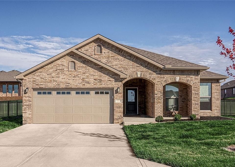This floor plan features an all-brick exterior and a covered porch accented by two elegant arches for a welcoming entrance. The open-concept layout includes 10-foot ceilings in the entry, main living area, and primary suite. The kitchen offers a peninsula for meal preparation and entertaining. Additional highlights include a fully sodded yard with a landscape package, a covered back patio, a master suite with a soaker tub, separate shower, and dual vanities. Photos are a representation of the Angie floor plan. Selections may vary from this home, and plans are subject to minor changes.