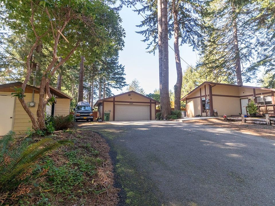 Nestled among the trees is this well cared for 3bd/2ba ranch home. Updated kitchen in 2014.Stainless appliances, hickory cabinets, eat bar, slider out to spacious deck for outside entertaining. Large primary suite w/slider out to backyard concrete patio and hot tub new in 2023. Electrical panel updated and new heat pump in 2023. Stamped concrete walk way, new concrete driveway, bring your toys with plenty of space to park your sandrail, boat & RV w/30 amp service in place. Comp Roof approximately 15 years old on home. Metal on garage, new fence across backyard line. Generator 22000 watt in place needs propane bottle. Minutes to Honeyman State Park & the Dunes.All New roof & 3 new skylights scheduled May 2024 ($16,000). 2024-05-21