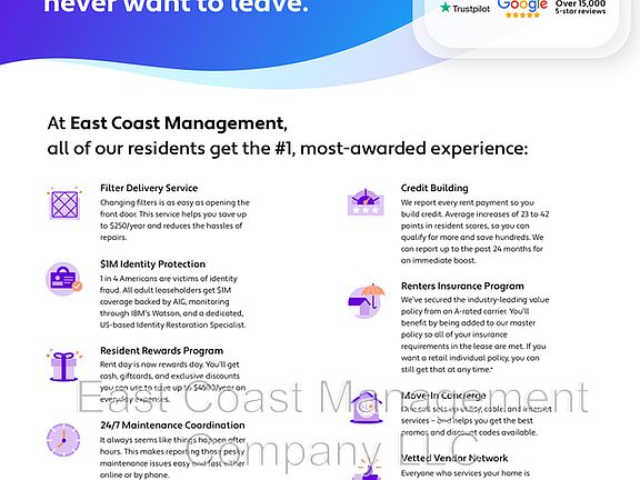 East Coast Management residents have the opportunity to be enrolled in the Resident Benefits Package (RBP) for $46.95/month which covers your REQUIRED liability renters insurance, as well as credit building to help boost the resident's credit score with timely rent payments, up to $1M Identity Theft Protection, HVAC air filter delivery (for applicable properties), move-in concierge service making utility connection and home service setup a breeze during your move-in, our best-in-class resident rewards program, and much more! Ask us about enrolling!
