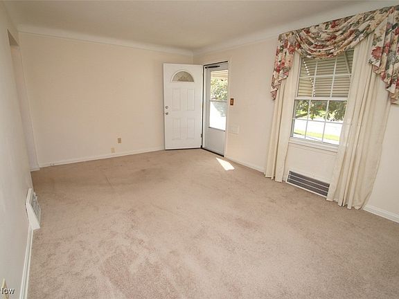 Inside, the front living room provides a cozy space, with carpet that hides hardwood flooring beneath. An additional family room, flooded with natural light from windows on three walls, provides a bright and inviting space for relaxation or entertaining. The kitchen includes a range and refrigerator, which stay with the home.