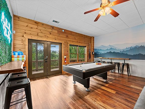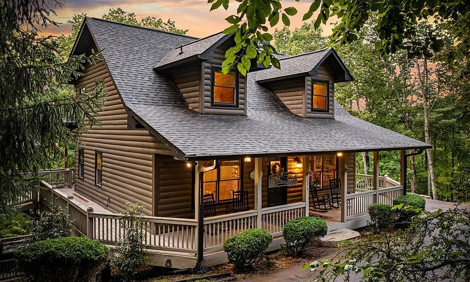 Welcome to this beautifully furnished, turnkey mountain retreat in Blue Ridge, Georgia, offering all-paved access, a paved driveway, and incredible long-range views the moment you step through the front door. The inviting covered front porch leads into a warm and open living space with wood floors, granite countertops, stainless appliances, and a vented gas log fireplace. Outdoor living is a true highlight with multiple covered porches, a stunning outdoor fireplace, a gazebo overlooking the mountains, a private fire pit, and a spacious yard perfect for cornhole or horseshoes. Inside, the main level features an en suite bedroom with a fully updated bath boasting tile floors, a walk-in tile shower, and double vanities with copper sinks. Upstairs, you'll find a cozy sitting area with TV and desk workstation, plus a large en suite bedroom with a huge walk-in closet and a luxurious bath with double vanities and a two-headed tile shower. The terrace level offers a modern electric fireplace, a pool table, a bunk room, a full updated bath with a tile walk-in shower, laundry, and plenty of space to relax and entertain. Complete with a luxurious hot tub to enjoy the panoramic mountain views, this property blends comfort, style, and functionality. Convenient to hiking, fishing, downtown Blue Ridge shops, and restaurants, this cabin has it all—whether you're looking for a private getaway, full-time living, or an income-producing vacation rental.