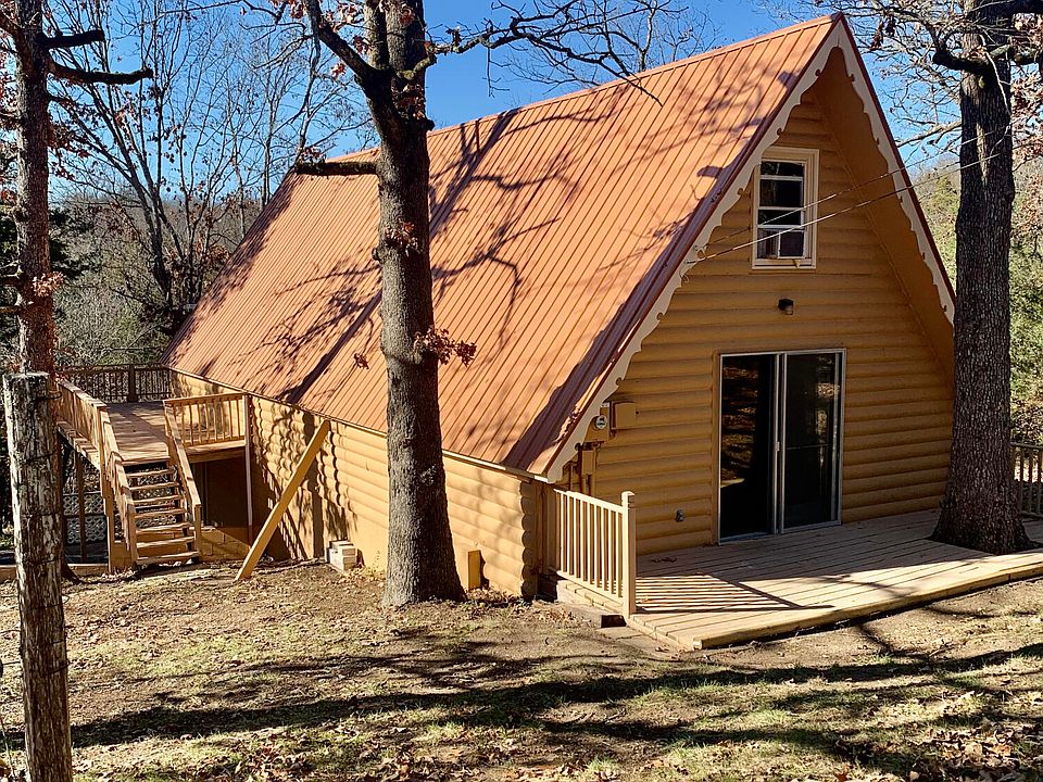 The One You've been Looking For! Quiet Country setting just outside of town with some acreage. This 3 bedroom A frame home has been recently updated with new paint, flooring, & some appliances. These 6+ acres have a Beautiful park-like setting that includes a wet weather creek & scattered mature trees. Convenient location that is just minutes north of Branson & has quick access to Hwy 65. The property has a 30' x 24' detached garage that has electric & water, as well as leveled parking pads for boats or RVs. Enjoy watching the wildlife, as several deer graze on the property frequently. All appliances are included in the sale & will remain with the home. All measurements are approximate.