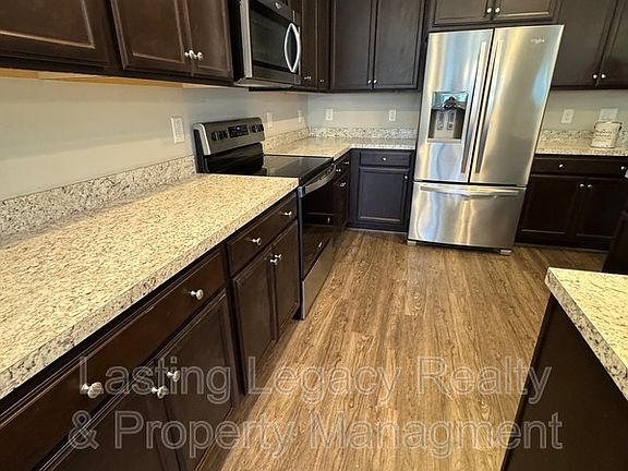 Step inside to find gorgeous hardwood LVP flooring throughout the main living areas, and enjoy an elegant kitchen equipped with stainless steel appliances, solid surface countertops, and a convenient microwave. The welcoming living room features a cozy fireplace, perfect for relaxing evenings.