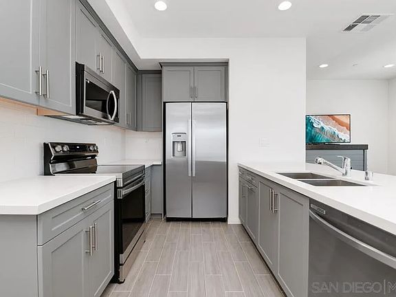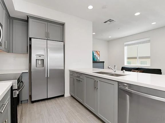 Modern and bright 2-bedroom, 2.5-bathroom townhome in the Terraces! Highly upgraded with OWNED SOLAR and built in 2023 by KB Homes, this unit features a spacious floor plan with 9-foot ceilings. This energy efficient and highly upgraded unit boasts a bright and airy layout complete with exquisite furnishings and subtle conveniences including tile floor, stackable laundry, central A/C and an attached 2-car garage. The community offers fantastic amenities, including access to play structures, central location and