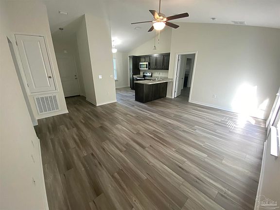 Tucked away at the end of a quiet street, this 1,270 square foot home is a perfect blend of timeless craftsmanship and coastal charm. Built in 2022, the exterior boasts full brick construction with Hardie board accents and aesthetic gables that elevate the curb appeal and bring coastal vibes to your doorstep. Inside, you'll find luxury vinyl plank flooring throughout, combining durability with modern style. The living space features vaulted ceilings that add volume and light, creating an inviting atmosphere. The kitchen is equipped with sleek stainless steel appliances and a stylish eating bar—ideal for casual dining or hosting friends. The home also includes a garage for added convenience and storage, and every detail has been thoughtfully chosen to deliver comfort, style, and efficiency. Ideally located just minutes from the beach, top-rated schools, and local shopping, this home brings together peaceful living and everyday convenience. Whether you're settling in or investing in your future, this coastal-inspired retreat is ready to welcome you home