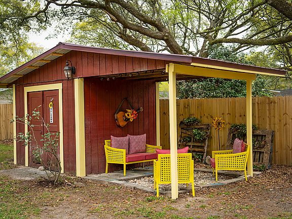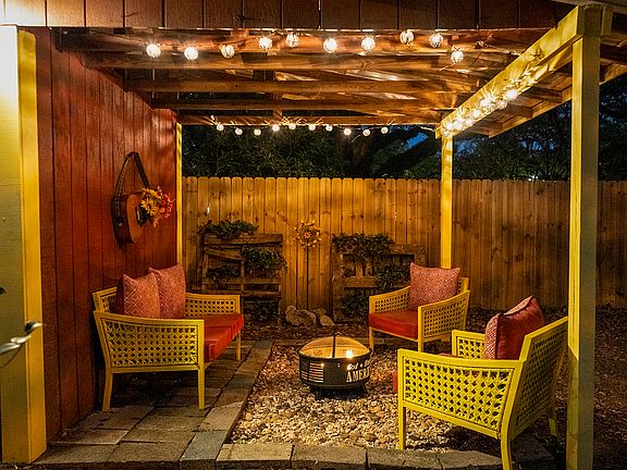 Situated in the heart of Florida, this residence boasts a spacious, fully fenced backyard, complete with a fire pit and multiple seating options, perfect for outdoor entertainment and relaxation.