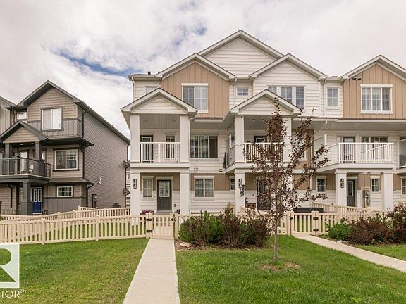 **NO CONDO FEES - END UNIT** This 1260sq ft 2 storey attached home is ready to go! As you enter the main level you will notice the open concept dining, kitchen with large island, s/s appliances including a bar fridge and coffee bar, quartz counter tops and living room with electric fireplace and feature wall. The upper level offers 2 large primary suites with ensuites and W/I closets. There is a balcony for hot Summer nights, over-sized fenced SE facing front yard, access to the heated double garage with workshop area and extra long driveway. Close to all amenities, EIA, Hwy 2 and Anthony Henday. Shows 10/10!