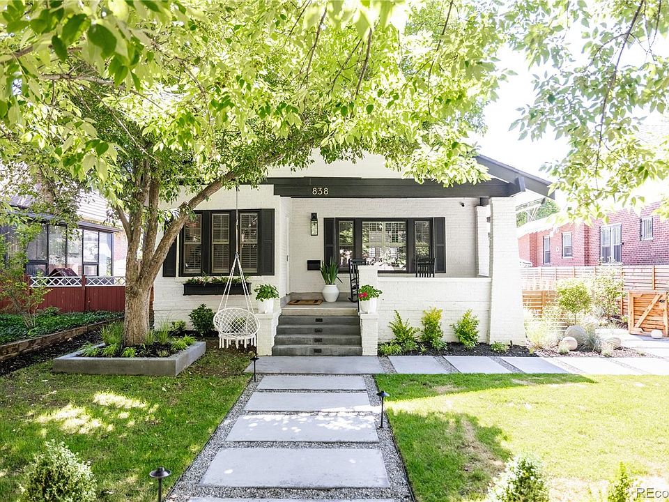 Blissful radiance cascades throughout this updated Congress Park home. Lush new landscaping envelops a white brick exterior with a charming covered front porch. Inside, an open floor plan unfolds with designer finishes throughout. New flooring flows throughout the main level, as natural light streams in through large windows. Enduring charm benefits from modern upgrades, with a living area that is grounded by a modern fireplace featuring a new gas insert. Delight in hosting at-home soirees in a dining area crowned by a chandelier. The home chef is treated to a stylish kitchen boasting new high-end appliances and new leathered quartz countertops, as well as designer Bedrosian’s tile. Downstairs, a spacious and open finished basement features two bedrooms, one oversized, with walk-in closet, which can be envisioned as primary suite, guest sanctuary, or room for an Au Pair, office or flex space, that includes laundry room, with truly endless possibilities. California Closets, designer tile, and LED lighting throughout are added luxuries. This oasis in Congress Park is an outdoor entertainers dream, including an outdoor gas fireplace, pavers, lighting controlled by smartphone, new sprinkler lines, premium Trex decking and a new XL Cal Spa hot tub, surrounded by new cedar fencing. The brand new custom detached 2 car garage, is wired and ready for a workshop and/or or electric vehicle charging stations, with a new sub panel. This home has had extensive exterior work to add a modern look, as well as new electrical panel, and new sewer line. Solar panels are purchased and owned, combating rising housing expenses. With it's coveted location, this home is in the heart of it all, and walking distance to the park as well as the newly constructed Congress Park pool. Within a 5 minute walk you will find yourself in the middle of Cherry Creek with access to all of its shopping and restaurants, as well as access to the best of Denvers’ public schools.