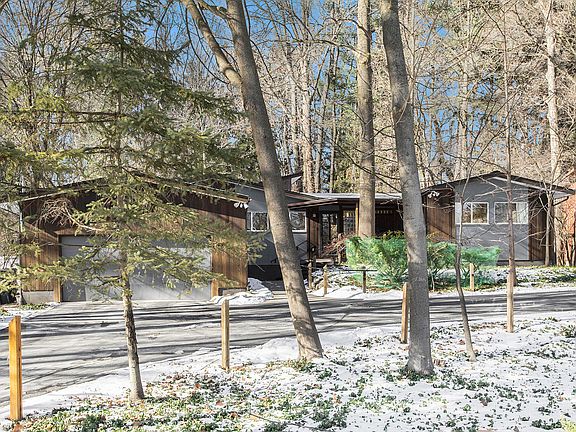Wonderful Mid-Century Modern L-shaped ranch designed and built by Zeke Jabbour on a private wooded lot in Ann Arbor Hills. This home has been perfectly cared for and nicely updated with fantastic Mid-Century detail throughout. The setting is special and features extensive Landscaping, paver patio, and a large backyard with walking trails. Interior highlights include hardwood floors in most rooms, extra windows that provide lots of natural light, oversized from living room, formal Dining, three season sunroom, family room with vaulted ceiling spacious kitchen with quartz counter tops, wonderful primary bedroom suite with updated bath attached, 3 nice sized kids bedrooms, and an updated 2nd bath. The basement is partially finished with great multi-purpose rec space, a 1/2 bath, and great storage. The home features a long list of improvements. In the last 10 years the home has new Driveway,Furnace, AC/Heat Pump, Generator, Roof, front porch, and sidewalk. You will love it