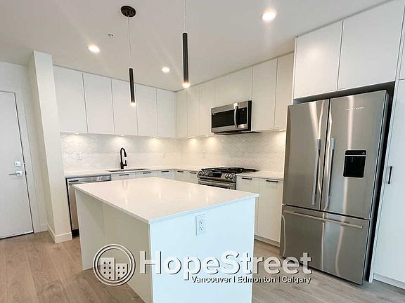 This 926 sq. ft. home at Latimer Village offers a bright, open-concept layout with 9-foot ceilings and large windows that fill the space with natural light. The kitchen features quartz countertops, a central island, and upgraded appliances including a gas range. The primary bedroom includes a walk-through closet and a double-sink ensuite, while the second bedroom offers its own walk-in closet. Enjoy views of the green courtyard from the private balcony. Laminate flooring runs throughout, with in-suite laundry, two underground parking stalls, and a large storage room near the elevator. Unfurnished. Located in a walkable community close to cafes, transit, Highway 1, parks, schools, and shopping. Book your viewing today!