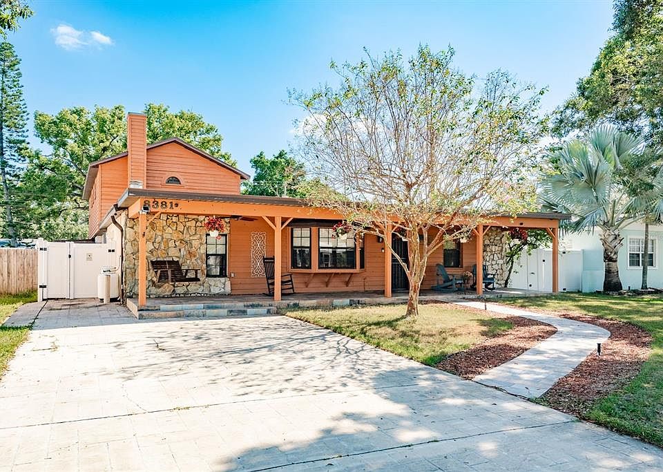 Welcome to your dream home in sunny Pinellas Park! This spacious 4-bedroom, 3-bath residence blends modern comfort with resort-style living with over 2,300 sq ft. The exterior has been freshly painted along with a brand new roof from 2025 and brand new gutters. Step inside to discover an open-concept layout filled with natural light, featuring a beautifully updated kitchen, generous living areas, and 3 bedrooms on the main floor to accommodate multi-generational living. The primary suite is your private retreat on the second floor (780 sq ft), with a fireplace complete with a spa-inspired bathroom. The shower exudes a luxurious, spa-like feel with a dramatic modern design including a built-in bench with body jets and handheld sprayer. The oversized walk-in closet is perfectly paired with built-in cabinetry for additional storage. Off of the primary bedroom, you will have direct access to an expansive rooftop patio—perfect for morning coffee or evening sunsets. Outside, the backyard is an entertainer’s paradise, boasting a giant sparkling pool surrounded by lush landscaping including fruit trees (hybrid citrus and mango) finished with pavers and a stylish concrete stamped patio and "Smart" outdoor color changing lighting near the pool. There is plenty of space for lounging or hosting gatherings. In the yard, you will also find access to the workshop (16X17) to accommodate your storage needs or woodworking you are considering. Additional storage shed in the backyard is 12X18. (AC 2017) (Hot Water Heater 2022) (Kitchen Appliances 2022) (Gutters 2025) (Exterior Paint 2025)(Vinyl fence 2022) (Pool Pump 2024) Roll Down shutters around the home for quick protection and peace of mind in this non-flood zone. 15 minutes to Madeira beach, 20 minutes to Tampa International Airport and 20 minutes to Armature Works. Don’t miss your chance to own this one-of-a-kind property—schedule your private showing today!